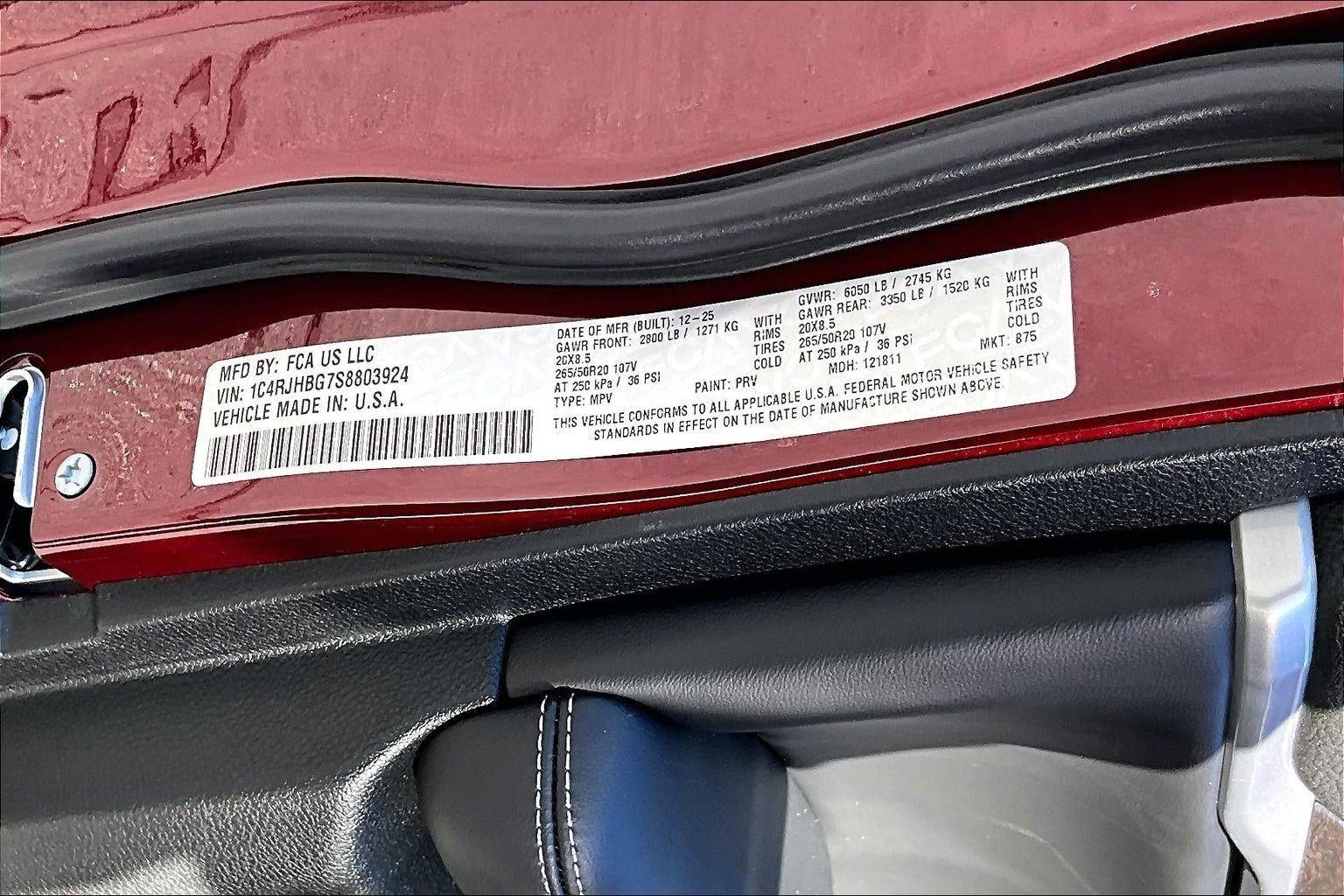 ENGINE: 3.6L V6 24V VVT UPG I W/ESS, TRANSMISSION: 8-SPEED AUTOMATIC (850RE), QUICK ORDER PACKAGE 22E, WHEELS: 20"" X 8.5"" GLOSS BLACK PAINTED ALUMINUM, TIRES: 265/50R20 A/S PERFORMANCE, MONOTONE PAINT, VELVET RED PEARLCOAT, GLOBAL BLACK, CAPRI LEATHERETTE SEATS, TRAILER TOW PACKAGE, BLACK APPEARANCE PACKAGE, DUAL-PANE PANORAMIC SUNROOF, MODEL YEAR TRACKING
