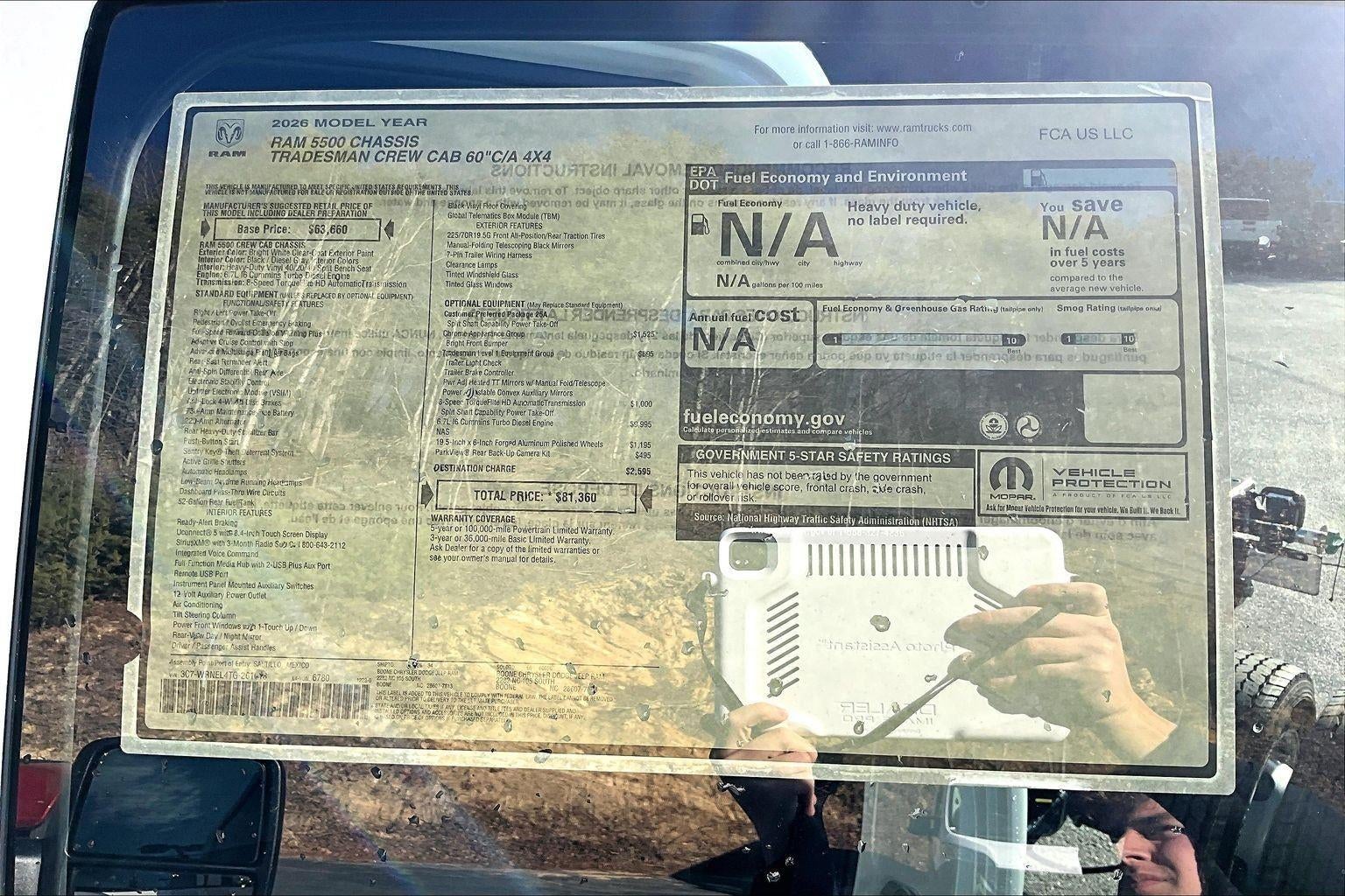 ENGINE: 6.7L I6 CUMMINS TURBO DIESEL, TRANSMISSION: 8-SPEED TORQUEFLITE HD AUTOMATIC (DFM), QUICK ORDER PACKAGE 25A TRADESMAN, WHEELS: 19.5"" X 6.0"" FORGED ALUMINUM POLISHED, TIRES: 225/70R19.5G FT ALL POSITION, RR TRACTION, BRIGHT WHITE CLEARCOAT, DIESEL GRAY/BLACK, HD VINYL 40/20/40 SPLIT BENCH SEAT, GVWR: 19,500 LBS, CHROME APPEARANCE GROUP, TRADESMAN LEVEL 1 EQUIPMENT GROUP, 50 STATE EMISSIONS, TRAILER BRAKE CONTROL, PARKVIEW REAR BACK-UP CAMERA